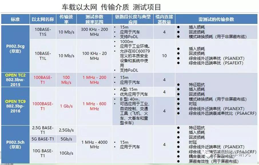 以太網(wǎng)技術(shù)這么好,怎么保證它的質(zhì)量呢?我們需要有量化的數(shù)據(jù)來評判以太網(wǎng)線束的傳輸質(zhì)量,這就涉及到了測試。下圖是目前國際上涉及到車載以太網(wǎng)的相關(guān)技術(shù)標(biāo)準(zhǔn),準(zhǔn)確講還不是汽車以太網(wǎng),而是單線對以太網(wǎng)傳輸介質(zhì)的標(biāo)準(zhǔn)。第一項(xiàng)描述的是用單個(gè)線對傳輸10比特每秒的數(shù)據(jù),傳輸距離是1000米,這樣的傳輸應(yīng)用在通信場合,目前是草案階段,很快會成為正式標(biāo)準(zhǔn)公布。第二和第三部分分別是OPEN聯(lián)盟和IEEE同時(shí)采用的,OPENTC2工作組研究的是百兆比特每秒傳輸速率的單線對車載內(nèi)的介質(zhì)應(yīng)用,OPENTC9工作組是專門研究千兆以太網(wǎng)的傳輸速率的傳輸介質(zhì),這兩項(xiàng)目前已成為以太網(wǎng)傳輸介質(zhì)主流的發(fā)展方向,未來更高速率的傳輸技術(shù)也在研究中。