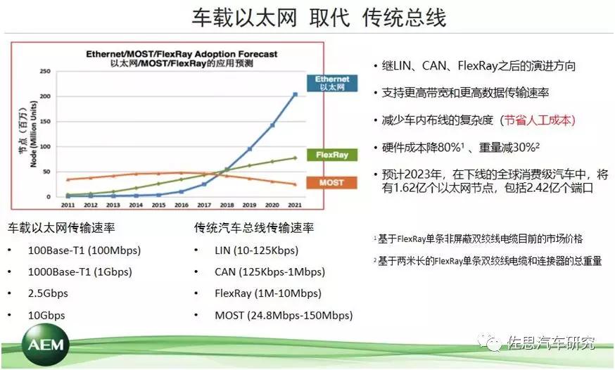 傳統(tǒng)的汽車總線用的非常好,為什么會被以太網(wǎng)技術(shù)所取代呢?我個(gè)人認(rèn)為有兩大驅(qū)動力,第一是成本。大家可以看到,采用以太網(wǎng)技術(shù)的線束或者是車內(nèi)布線,它的復(fù)雜度會降低,線束的數(shù)量會減少,所節(jié)約下來的無論是硬件成本還是人工成本,都是非常顯著的。數(shù)量減少以后,線束的總重量也會降低。這里有兩個(gè)量化數(shù)據(jù),一個(gè)是硬件成本降80%、一個(gè)是重量減30%,兩個(gè)數(shù)據(jù)分別來自于兩個(gè)技術(shù)報(bào)告,也是來自于互聯(lián)網(wǎng)。第二個(gè)驅(qū)動力是技術(shù)層面,車載以太網(wǎng)技術(shù)能夠提供更高的傳輸速率。